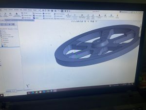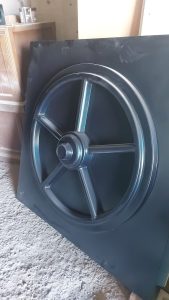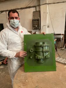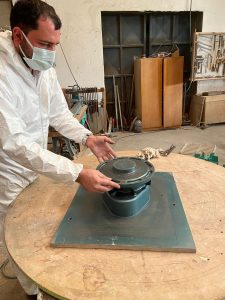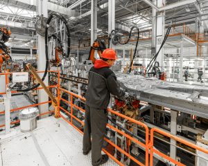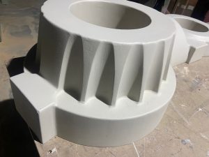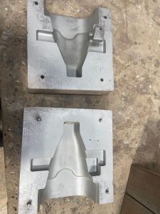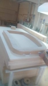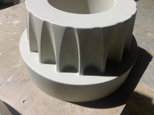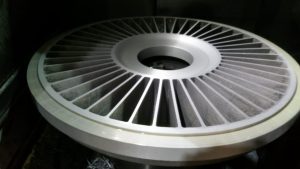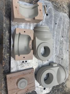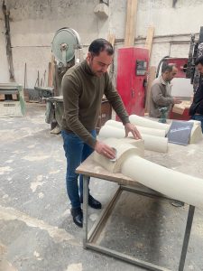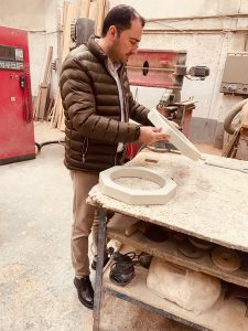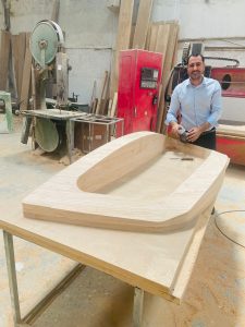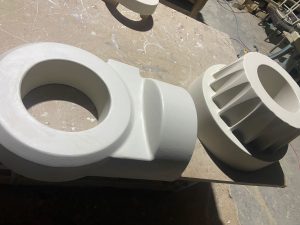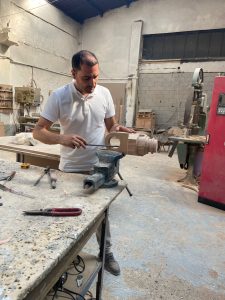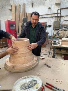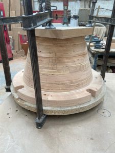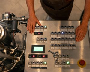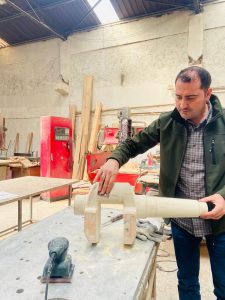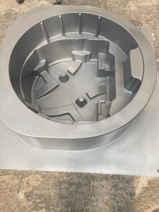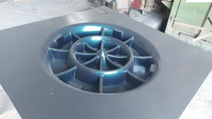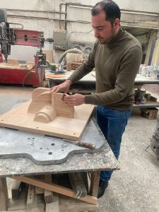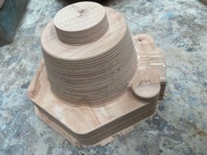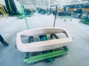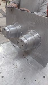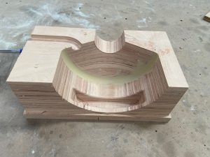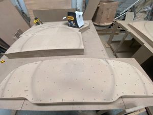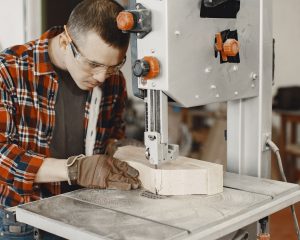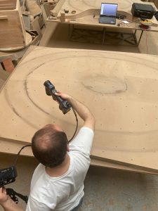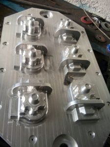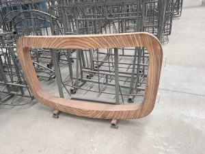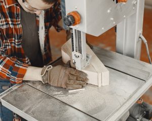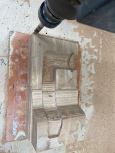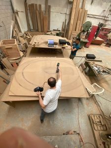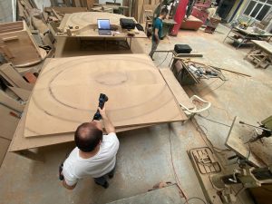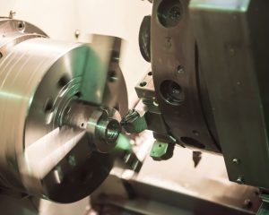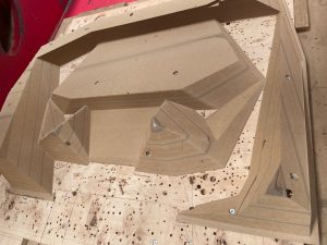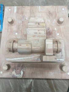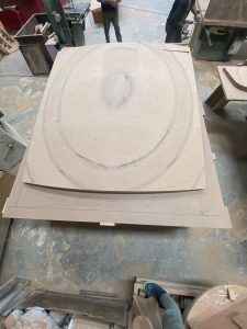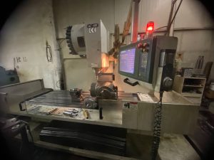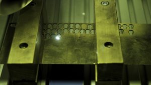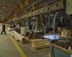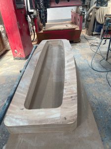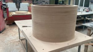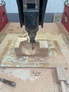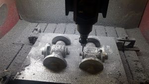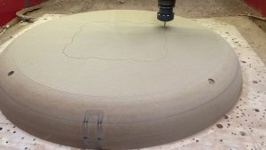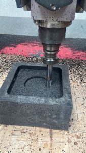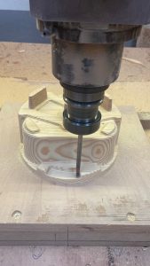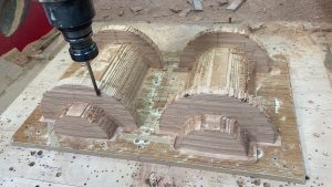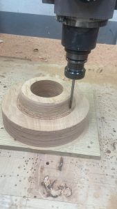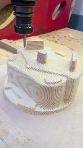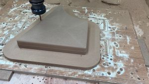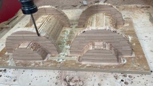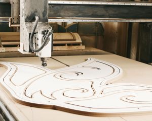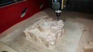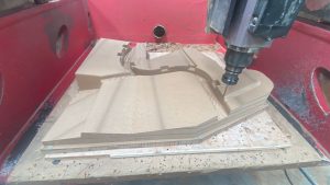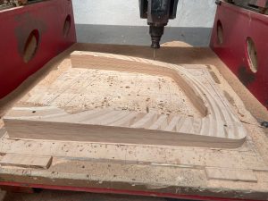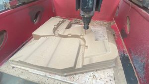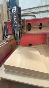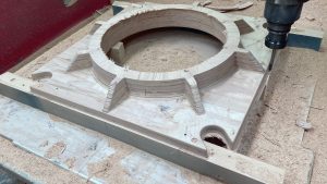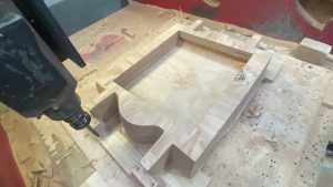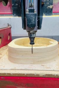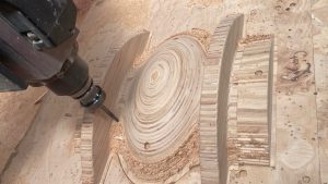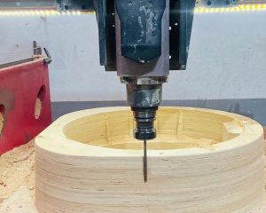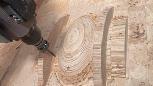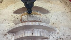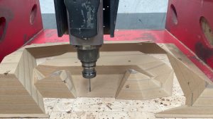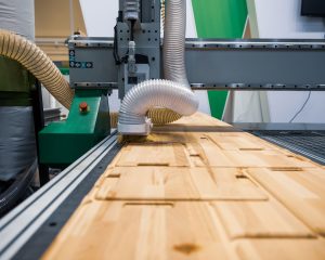 Milling machine with CNC cutting the wooden workpiece. Media. Close up of milling cutter in work at the factory